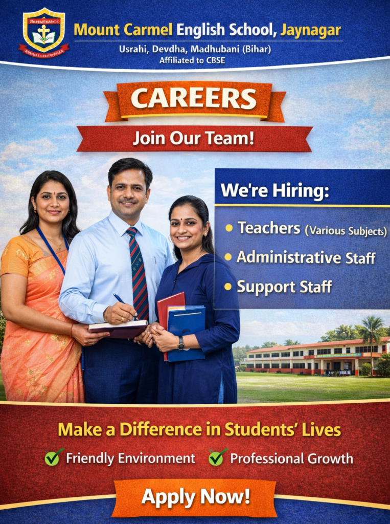 Join Mount Carmel English School, where passion for education meets innovation! We are committed to nurturing young minds and shaping future leaders through excellence in teaching, creativity, and holistic development. If you are an enthusiastic educator or professional looking for a rewarding career in the education sector, we invite you to be part of our dynamic team.